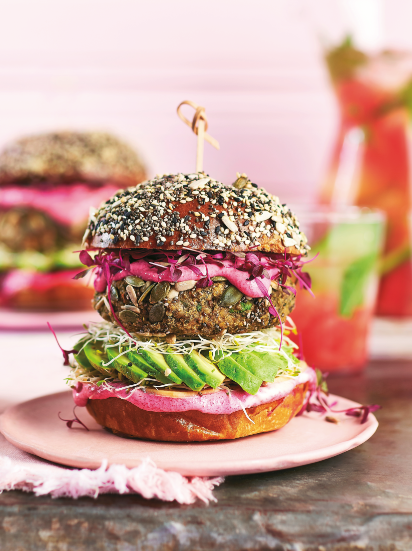 Now you are ready to assemble your burgers! Spread your bottom bun with a generous dollop of mayo. Layer your beet pickle so that the beautiful pink liquid ripples through the glorious white mayo. Next carefully place your mushroom burger on top of the pickle. Top with a little more mayo, a little more pickle, sprouts and a sprinkling of coriander. Devour!