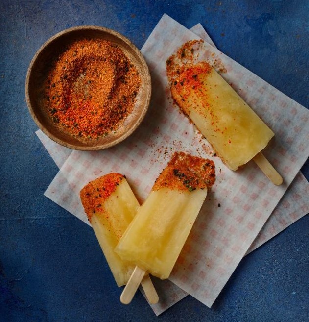 To serve, run the moulds briefly under a hot tap, then remove the lollies. Dip the ends into a bowl of the shichimi togarashi (or sprinkle it over) for an extra flavour hit.
